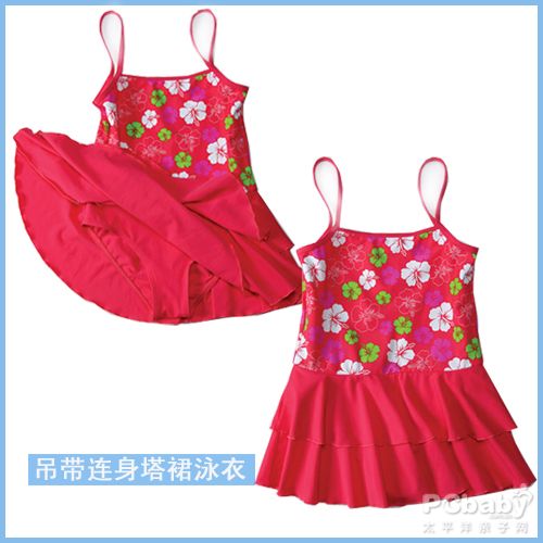 大红色的裙底配上白色和绿色的小印花,这条连身裙泳衣很适合平时比较文静的小宝宝。两层的裙摆样式也会让宝宝显得很有淑女风范。上身吊带的设计又让这件裙式泳衣显得不会呆板。你家的宝宝是小淑女吗?若果是,那绝对适合这款泳衣。